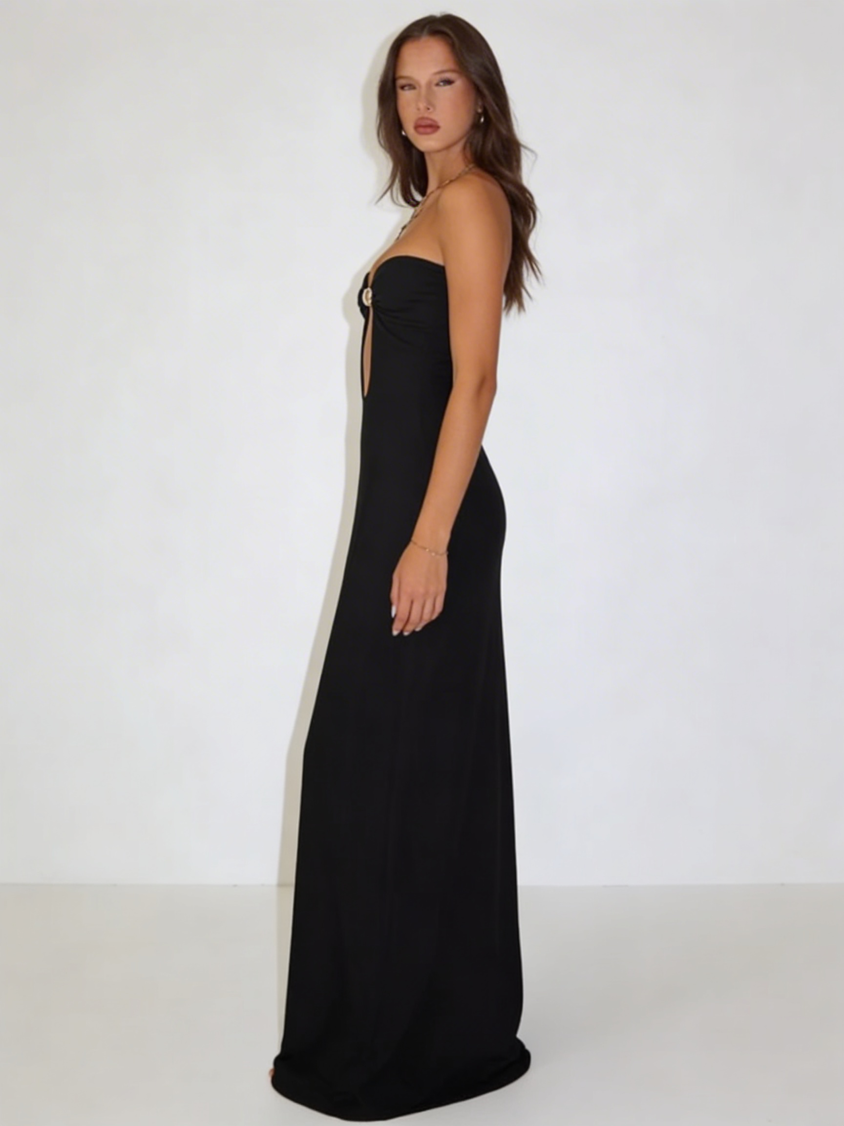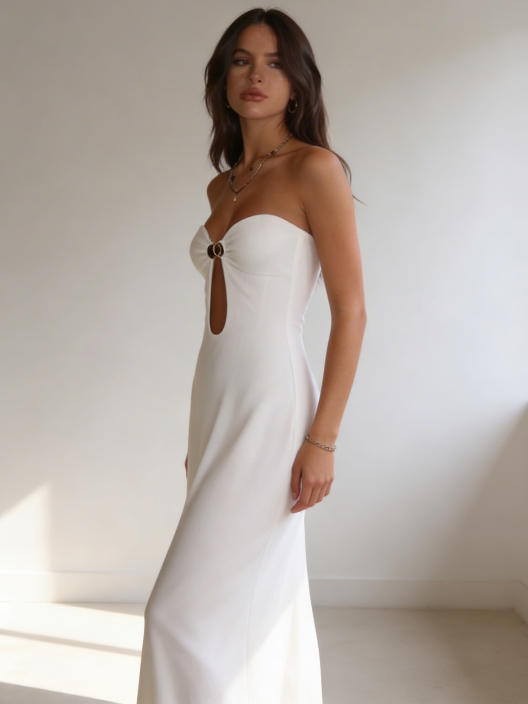 ✔️ Krój bez ramiączek – eksponuje ramiona i dekolt